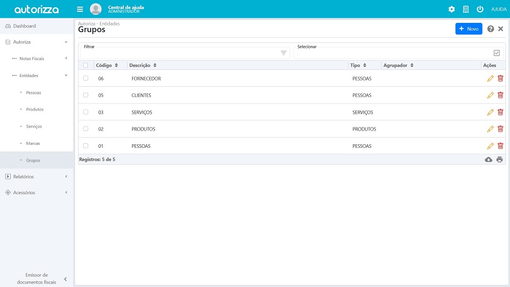 Ao abrir a tela de grupos, será exibida uma lista com os grupos padrão gerados pelo sistema.