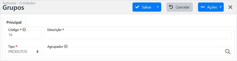 - Tipo (obrigatório): Define onde o grupo será válido, podendo ser utilizado em produtos, serviços e entidades (clientes, fornecedores, transportadores, compradores e vendedores).