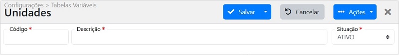 Em seguida o código é gerado de forma automática. Informe o código da unidade e a descrição correspondente. Depois, clique em