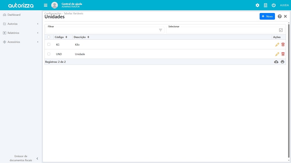 Agora, na tela de tabelas auxiliares, temos a opção unidades. Clique no
