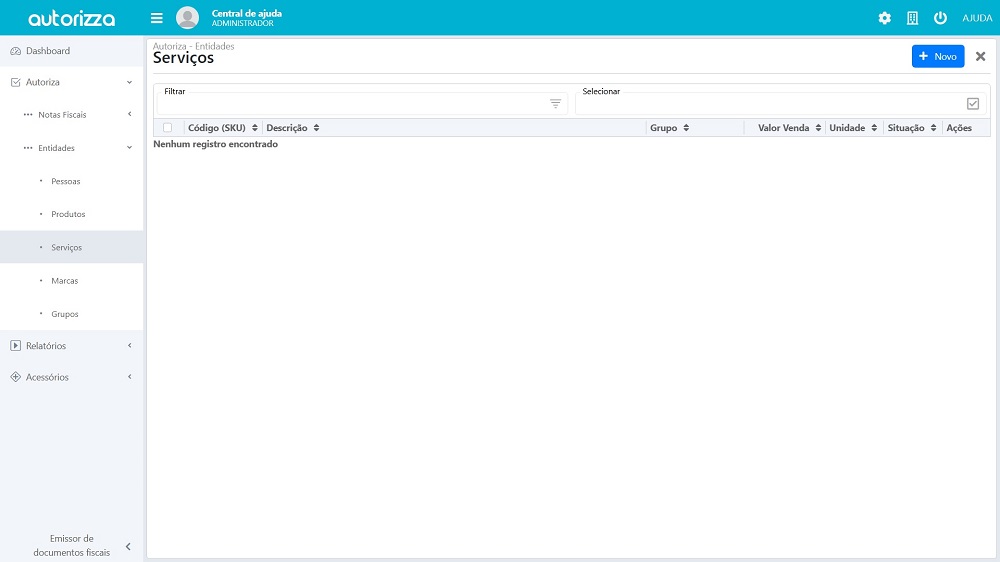 Para realizar o cadastro de um serviços, vá até o menu lateral esquerdo e siga o caminho Autoriza > Entidades > Serviços.