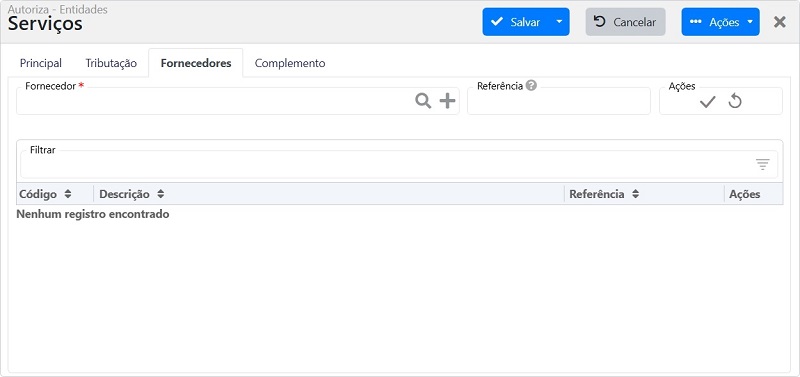 Na aba Fornecedor, você pode vincular fornecedores cadastrados no sistema que executam esse serviço.