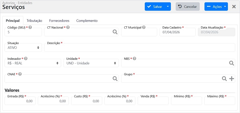 - Situação: Define se o serviço está ativo ou inativo.