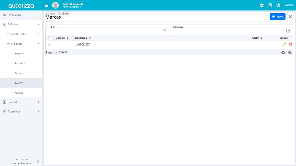 Para realizar o cadastro de uma marca, vá até o menu lateral esquerdo e siga o caminho Autoriza > Entidades > Marcas.