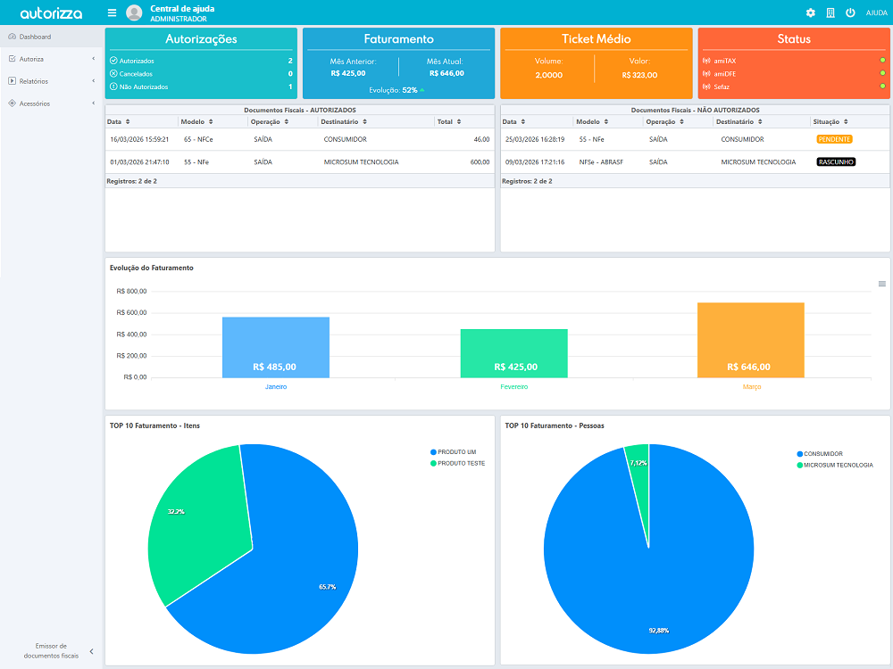 - Autorizações: Apresenta um resumo das notas fiscais, como autorizadas, canceladas e não autorizadas.