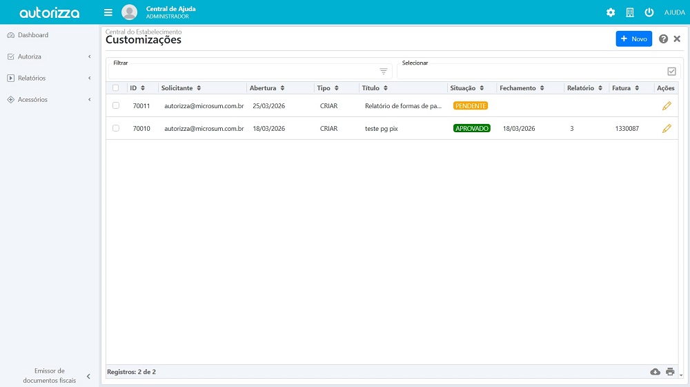 Agora, basta clicar em customizações. Será exibido um relatório com todas as customizações que já foram solicitadas.