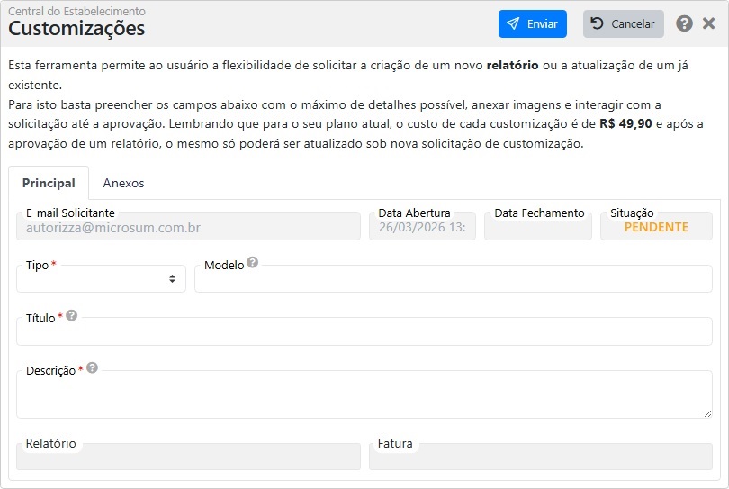 - Descrição: descreva detalhadamente o que você deseja no relatório. Quanto mais informações, melhor será o entendimento.