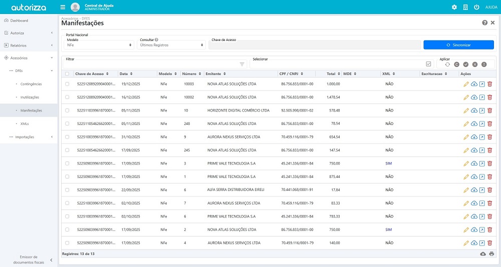 A tela de manifestações, conhecida também como MD-e (Manifestação do Destinatário Eletrônica), é utilizada por empresas para registrar a ciência de operações realizadas por fornecedores em seu CNPJ. Ela permite confirmar, contestar ou declarar o desconhecimento de uma operação, além de possibilitar o download do arquivo XML para a escrituração da nota fiscal dentro do sistema e dar entrada nos produtos.