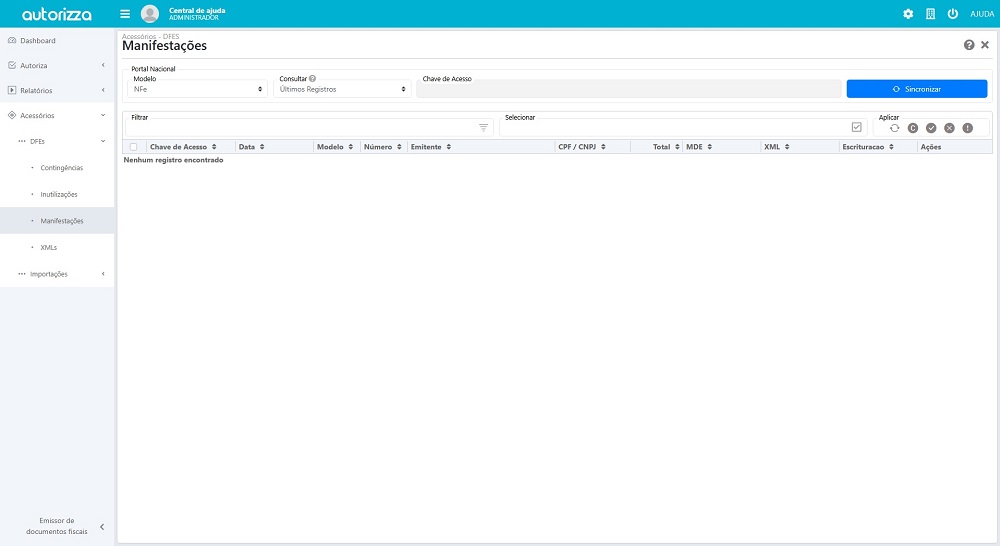 Para acessar a funcionalidade, vá até o menu lateral esquerdo e siga o caminho: Acessórios > DFEs > Manifestações.